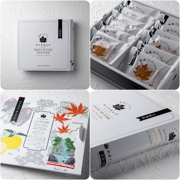おしゃれな本仕様のパッケージは、中を開くと箕面に関するもみじ、滝、猿、柚子のかわいい絵が現れます。個包装なので会社や大人数への差し入れにもお勧めです。