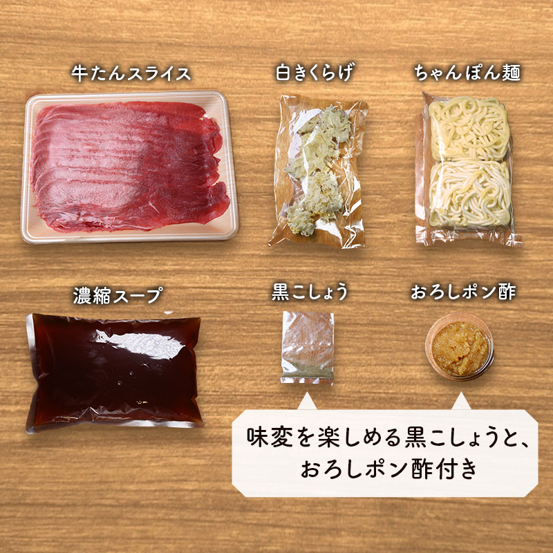 | 内容量 | ・牛たんスライス 250g ・濃縮スープ 750cc ・白きくらげ 15g ・おろしポン酢 50g ・黒こしょう 10g ・ちゃんぽん麺 200g <ご用意いただくもの> ・白ネギ(1束) ・レタス(1/2玉) ※お好みで豆腐、キノコなどご用意いただくのもオススメです! |