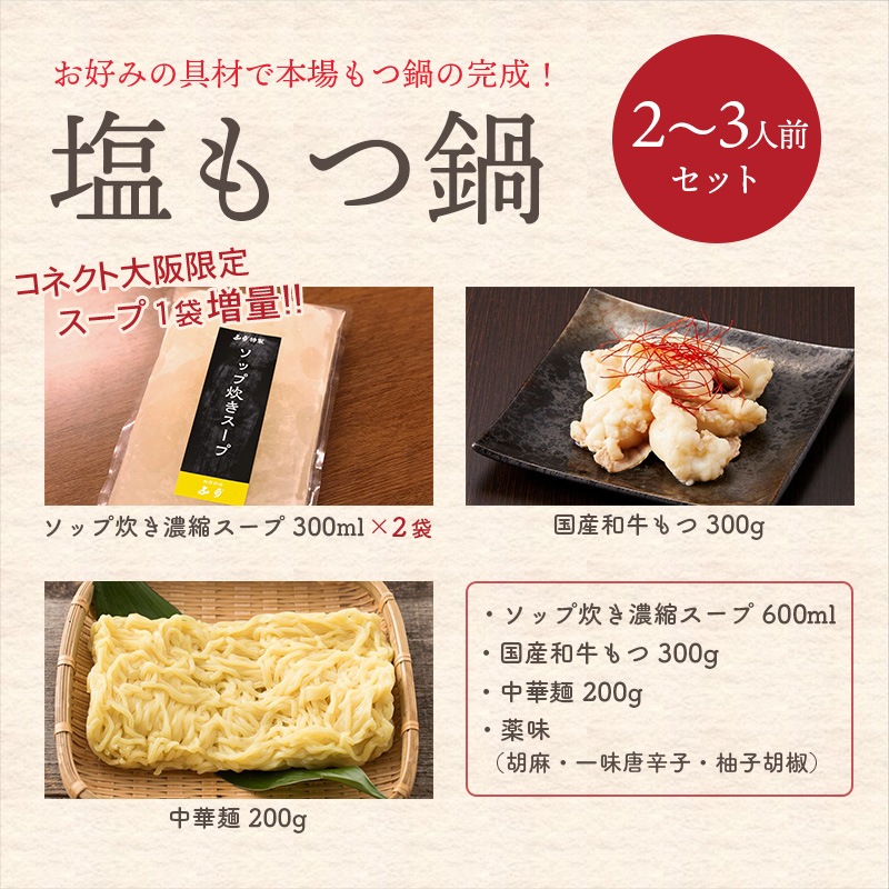 | 内容量 | ・国産牛もつ(小腸)300g ・ソップ炊き濃縮スープ600ml(300ml×2袋) ・〆の中華麺200g ・薬味 (胡麻・一味唐辛子・柚子胡椒) |