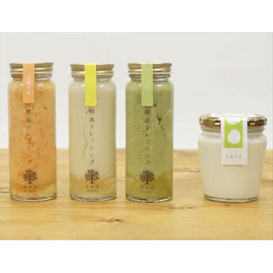 | 内容量 | ・酵素ドレッシング200ml×3本 (プレーン、有機人参、バジル) ・豆乳マヨS瓶 200g |
