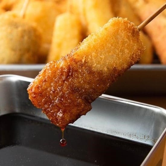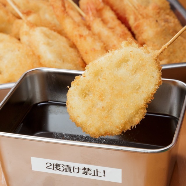 | 原材料名 | <串かつ> 衣(パン粉、バッター粉(小麦粉(国産)、玉子)豚肉、牛肉、鶏肉・チーズ(生乳、食塩)、エビ、いか、蓮根、じゃがいも、さつまいも、紅しょうが(一部に豚肉・牛肉・鶏肉・エビ・乳成分・小麦・卵を含む) <ソース> ウスターソース、果実酒、たまねぎ、トマト・ジュースづけ、砂糖、トマトケチャップ、りんご酢、はちみつ、加工黒糖(原料糖、黒糖)、しょうゆ/カラメル色素、香辛料、酸化防止剤(亜硫酸塩)、pH調整剤、調味料(アミノ酸等)、香料、(一部に小麦・大豆・りんごを含む) ▼アレルギー特定原材料 豚肉・牛肉・鶏肉・エビ・乳成分・小麦・卵・大豆・りんご |