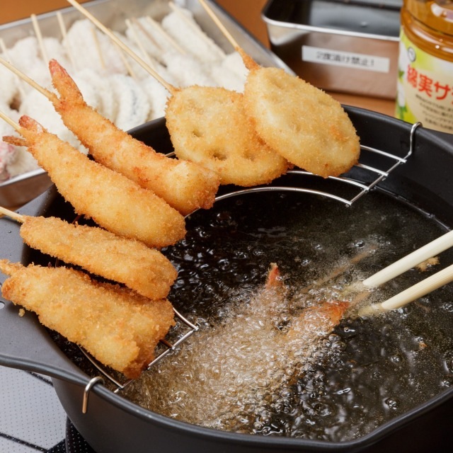 | お召しあがり方 | 冷凍状態のまま、170度に熱したたっぷりのサラダ油(油量目安900g)で揚げてください。 揚げ終わったあとは、串かつソースをたっぷりつけてお召し上がりください。 <揚げ時間目安>170℃の油で、 串かつ…5分(チーズ系の串かつは3分) |
