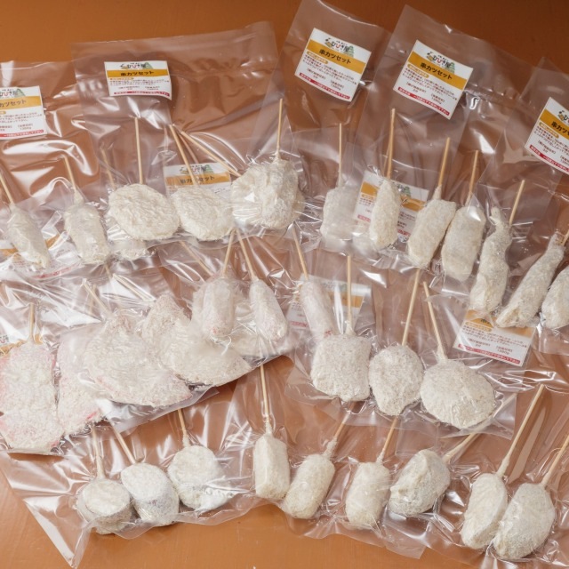 | 内容量 | ◎冷凍串かつ 880g 12種×各3本 ・豚ヘレ×3本 ・牛×3本 ・鶏もも×3本 ・赤ウインナー×3本 ・ハムカツ×3本 ・海老×3本 ・イカ×3本 ・じゃがいも×3本 ・れんこん×3本 ・さつまいも×3本 ・紅しょうが×3本 ・プロセスチーズ×3本 ◎串かつソース(240ml)×1袋 ※このセットにソース缶はお付けしておりません。 |