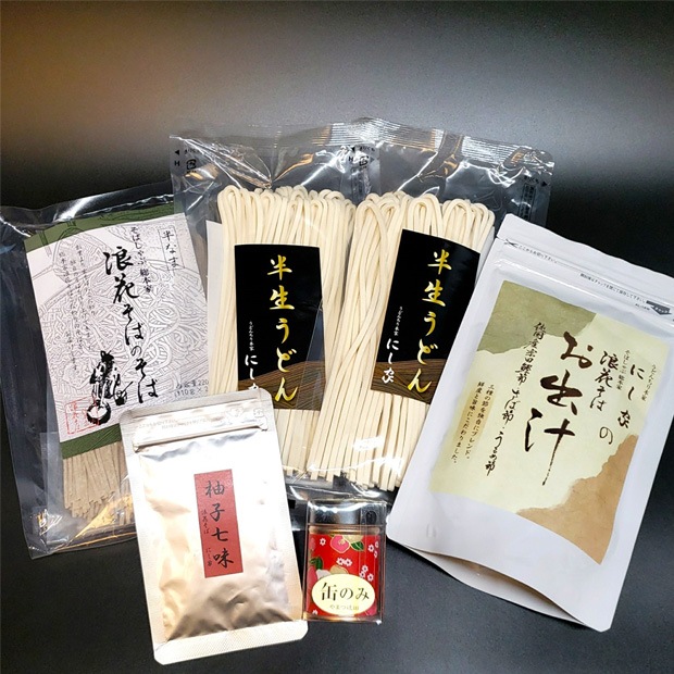 | 賞味期限 | [半生うどん]製造より90日 [半生そば]製造より90日 [にし家のお出汁]製造より1年 [柚子七味]製造より1年 |