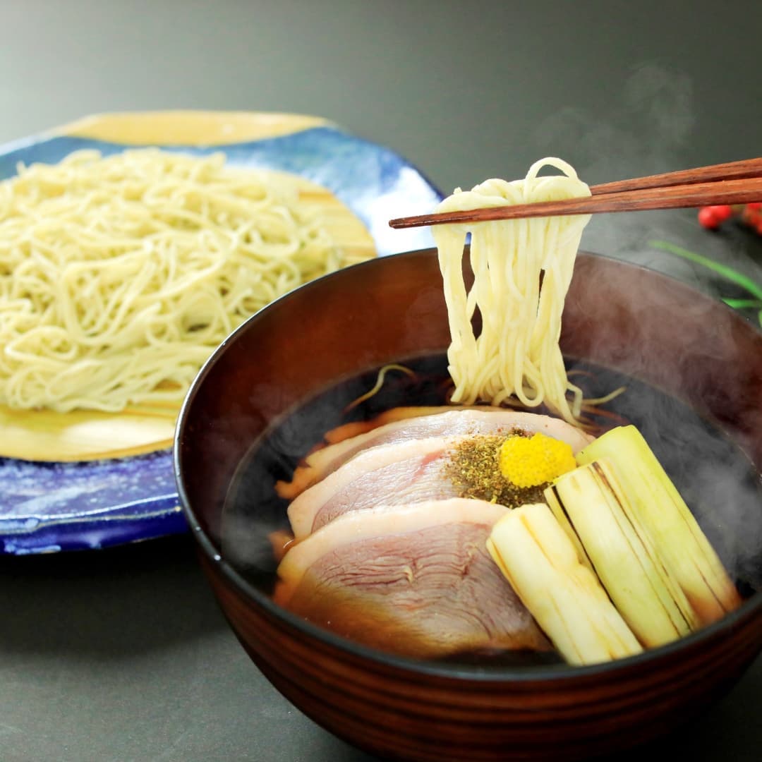 一晩かけて作るそばつゆのなかに京鴨を加え、うまみが凝縮されたつけ汁でいただくそば。